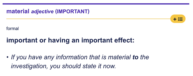 오늘은 material이라는 단어의 의미 중, 잘 모를 수 있는 ‘중요한’이라는 뜻에 대해 알아봤어! 이제는 이 단어를 어디에서 봐도 오역하는 일이 없겠지?