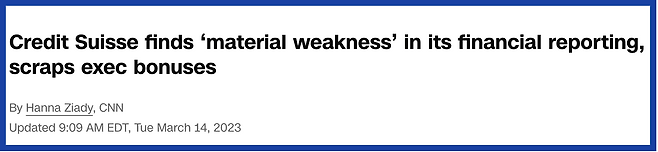 올해 UBS에 인수된 크레디트 스위스 은행에 대한 뉴스를 가져와봤어. 이제는 material weakness를 ‘소재적 약점’이라고 해석하는 사람은 없겠지? 중대한 약점, 중요한 약점이라고 해석해야 된다는 점, 잘 알아두자! 그럼 이제 예문을 한 번 볼까?