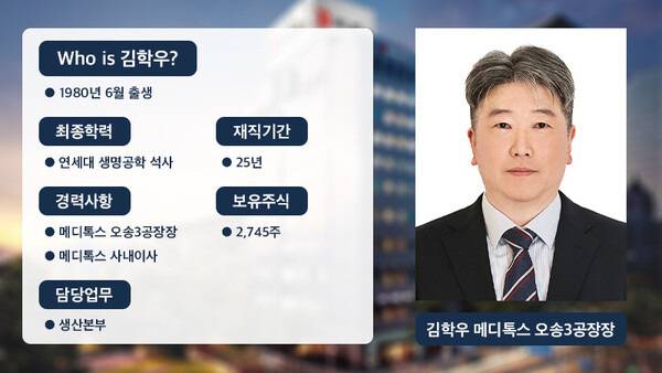 시장은 김 상무가 향후 오송3공장의 글로벌 생산능력(캐파)을 안착시키는 데 주력할 것으로 예상한다. 회사는 오송3공장을 글로벌 시장 확대를 위한 생산기지로 활용시킬 계획이라고 밝혀왔다. 특히 중동·남미 등 신흥시장의 수요에 대응하는 공급체계를 구축하는 데 집중할 것으로 점쳐진다. 메디톡스는 2024년 브라질 제약사 블라우와 7300만달러 규모 보툴리눔톡신 공급계약을 체결한 데 이어 인도네시아, 태국, 페루, 볼리비아 등에서 시판허가를 따내고 있다.