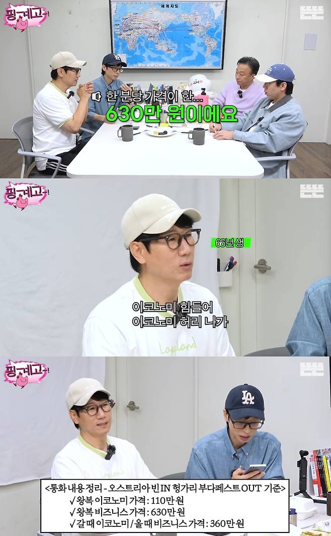 이어 유재석은 토론 중 "올 때만 비즈니스로 해도 가격이 반으로 내려간다"며 항공권 값에 대해 언급했다.