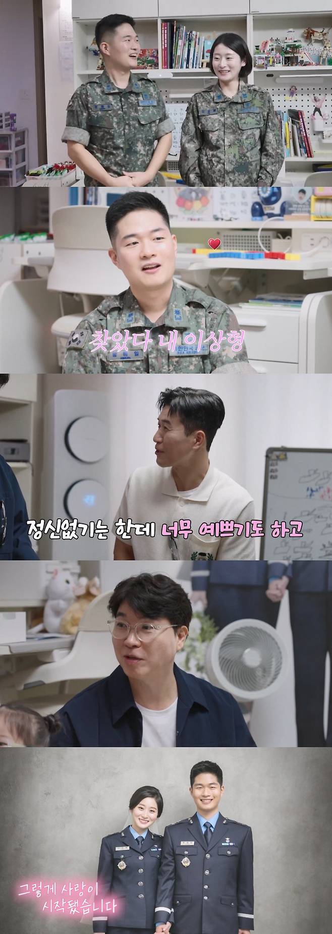 남편은 "이 여자다"라고 생각하며 처음 만난 날 이미 첫눈에 반했다고 전했다. 이에 아내는 "저도 호감이 있었다. '태양의 후예'를 보고 입대했는데 사무실에 '유시진 대위' 같은 사람이 있더라"며 아내 역시 이미 콩깍지가 꼈음을 밝혔다.