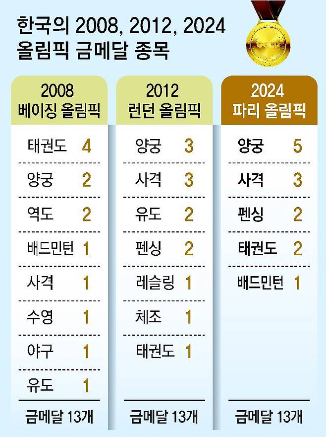 한국이 태권도(2개)와 배드민턴(1개)을 포함해 10일까지 따낸 전체 금메달 수는 13개다. 이는 2008년 베이징, 2012년 런던 대회 때와 똑같은 역대 최다 타이기록이다. 다만 한국이 금메달을 따낸 종목은 2008년 8개, 2012년 7개에서 이번 대회엔 5개로 갈수록 줄고 있다. 색깔과 관계없이 메달을 따낸 종목도 2008년 14개, 2012년 13개에서 이번 대회엔 9개다.
