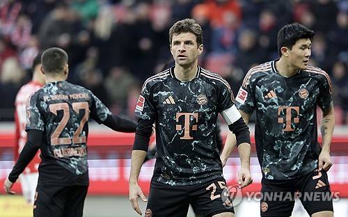 epa11776589 Thomas Mueller (C) of Munich reacts during the German Bundesliga soccer match between 1. FSV Mainz 05 and FC Bayern Munich in Mainz, Germany, 14 December 2024. EPA/RONALD WITTEK CONDITIONS - ATTENTION: The DFL regulations prohibit any use of photographs as image sequences and/or quasi-video.