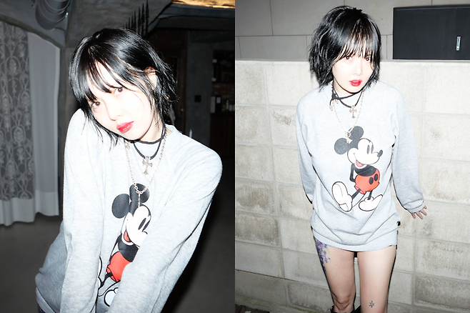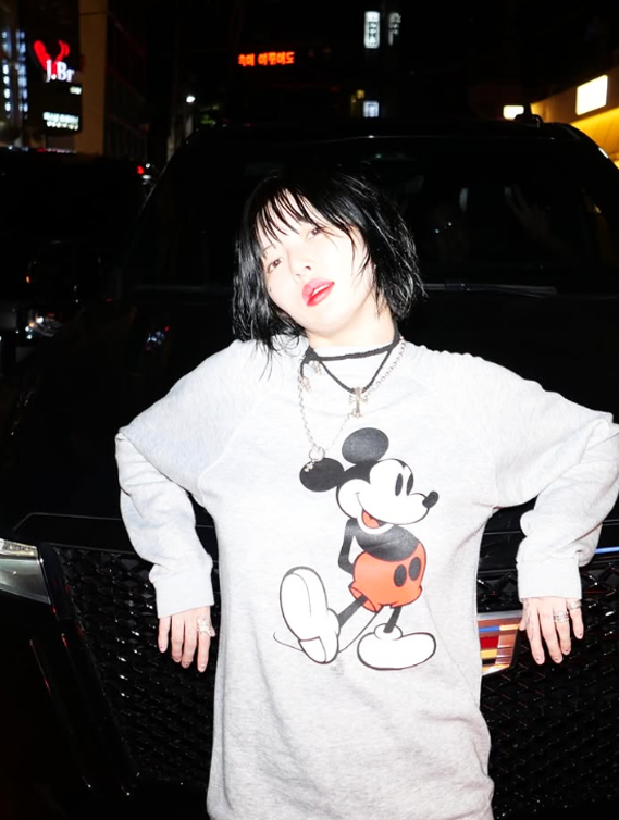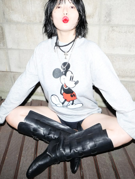 미키마우스 프린팅의 루즈핏 티셔츠와 초미니 팬츠를 활용한 하의실종 스타일로, 감각적인 스타일링이 돋보였다.