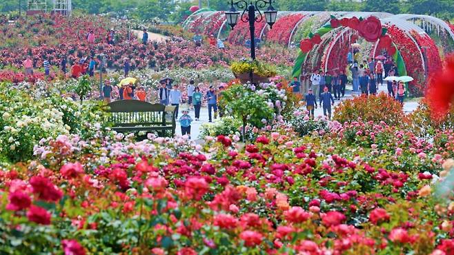 축제의 중심 공간인 장미원은 6만 5천700㎡ 규모다. 이 공간에는 200여 종, 2만 2천여 주의 장미가 식재돼 있어 대규모 경관을 형성한다.