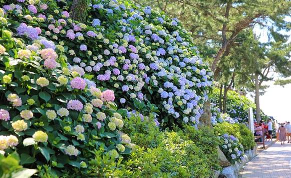 저구항은 6월~7월 사이 거제도 여행을 계획하는 분들이라면 꼭 알아둬야 할 거제 가볼만한 곳입니다. 명사해수욕장의 끝자락부터 저구항까지 약 200m 길이의 언덕에 탐스러운 수국이 풍성하게 만발하기 때문입니다.