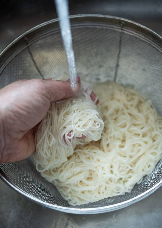 4. 소면은 끓는 물에 넣고 3~4분간 삶은 뒤 찬물에 비벼 헹궈 전분을 제거하고, 체에 밭쳐 물기를 뺍니다.