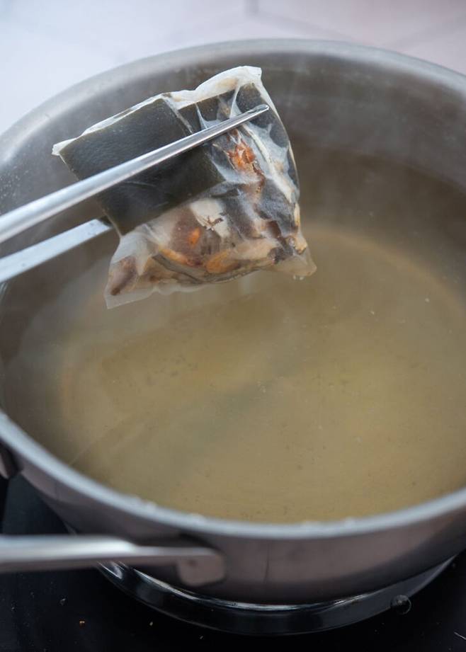 1. 멸치와 다시마로 육수를 만듭니다. 물 1.5L에 손질한 멸치 10마리, 다시마 한 조각을 넣고 15분 정도 끓인 후 건더기를 건져냅니다.