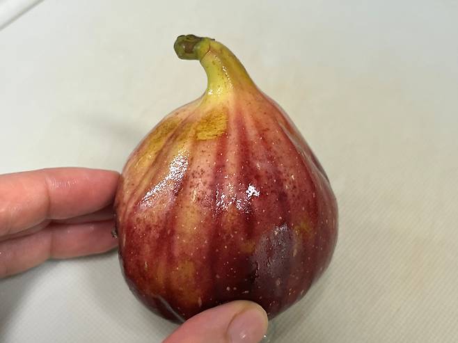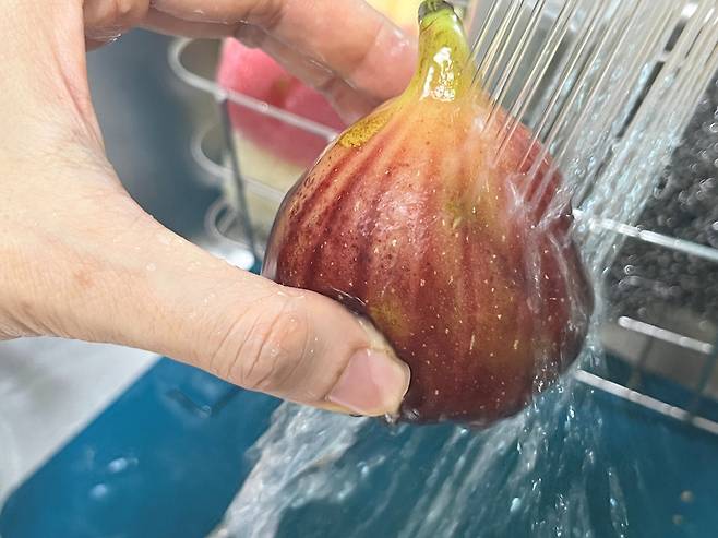 무화과는 과육이 부드럽고 껍질이 얇아 세척 시 주의가 필요한 과일입니다. 특히 아래쪽 배꼽 부분은 물이 들어가면 맛이 덜해지기 때문에 꼭지를 세워서 흐르는 물에 세척합니다.
