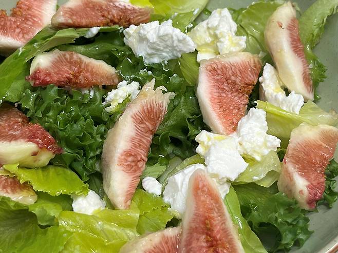 무화과는 샐러드 채소와 곁들여서 무화과 샐러드로 만들어 드셔도 좋습니다. 여기에 리코타 치즈나 부라타 치즈를 곁들이면 고급스러운 맛을 낼 수 있습니다.