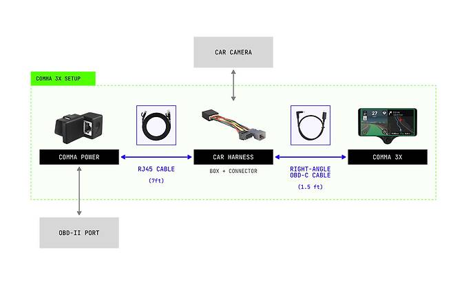 콤마는 레벨 2 운전자 보조 시스템(ADAS, Advanced Driver Assistance System) 기능이 제공되는 안드로이드 기반 하드웨어다. 스마트폰과 유사한 디자인으로 2160x1080 해상도의 OLED 디스플레이를 쓴다. 값비싼 LIDAR(Light Detection And Ranging) 방식이 아닌 카메라로 수집한 이미지 데이터를 기반하여 작동되는 것도 특징. 이 방식은 테슬라의 오토파일럿(Autopilot)과 유사하다고 평가받는다.