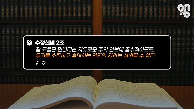 총기 사망자만 매년 수만명에 달하는 미국이고 총기 규제를 둘러싼 논란도 계속되는 나라이긴 한데 총기 소지 자체는 미국의 근본 기본권을 규정한 수정헌법에서 표현의 자유 다음으로 중요한 가치인 시민의 무장권 그것도 국가권력이 침해할 수 없는 권리로 명시돼있다.