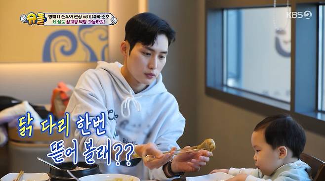 맛있게 먹는 은우에 김준호는 닭 다리를 건네며 "잡고 뜯어라"라고 말해 놀라움을 안겼다.