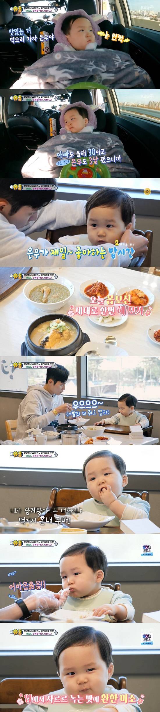 이날 김준호는 "새해니까 몸보신 해야한다. 아빠도 올해 서른이고 은우도 세 살 됐으니까 맛있는 거 먹으러 가자"며 삼계탕집으로 향했다.