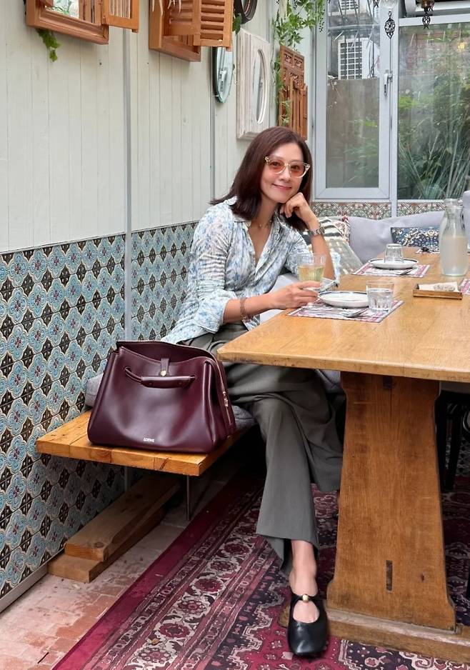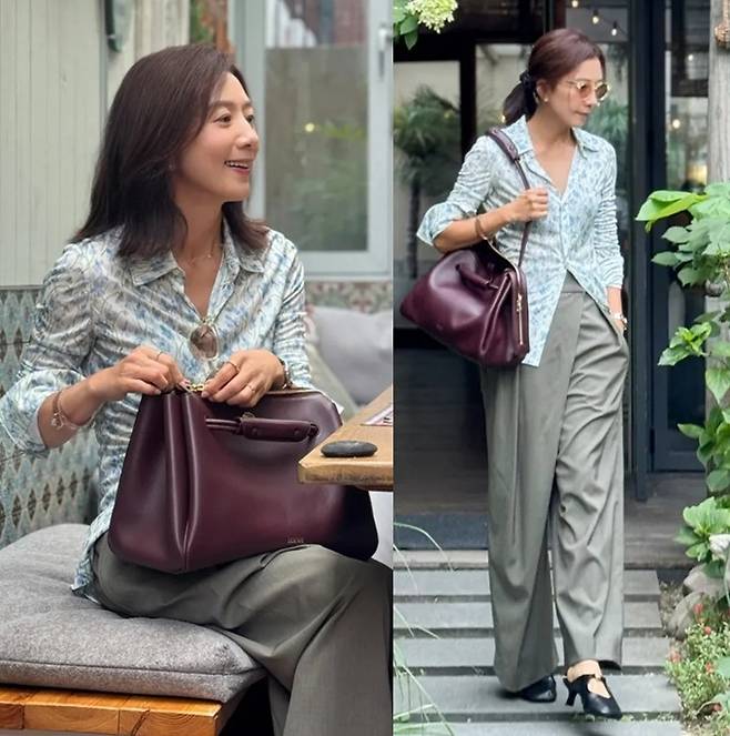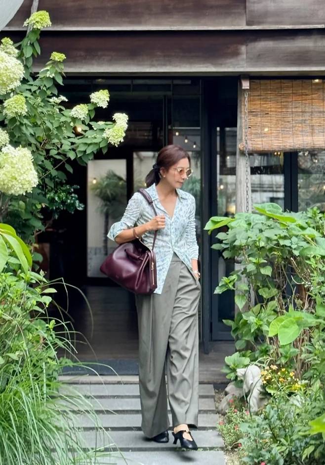 공개한 사진에서 김희애는 은은한 패턴의 내추럴한 셔츠와 그레이 톤의 와이드 팬츠를 매치해 슬림한 실루엣에 도회적인 무드의 데이트룩을 완성했다.