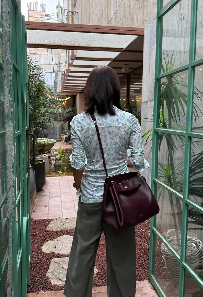 여기에 버건디 컬러의 빅 사이즈 백으로 포인트를 주어, 전체 룩에 깊이감 있는 고급스러움을 더했다.