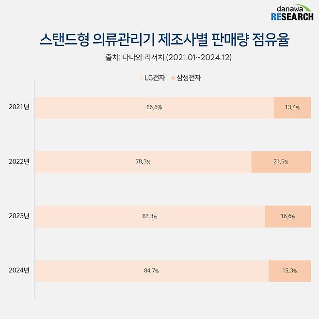 의류관리기 시장은 LG전자가 꽉 잡고 있는 모양새다. 2022년 잠깐 70%대로 주저앉긴 했지만 2021년부터 2024년까지 80%대의 점유율 유지하며 절대적인 1인자로 군림하고 있다.