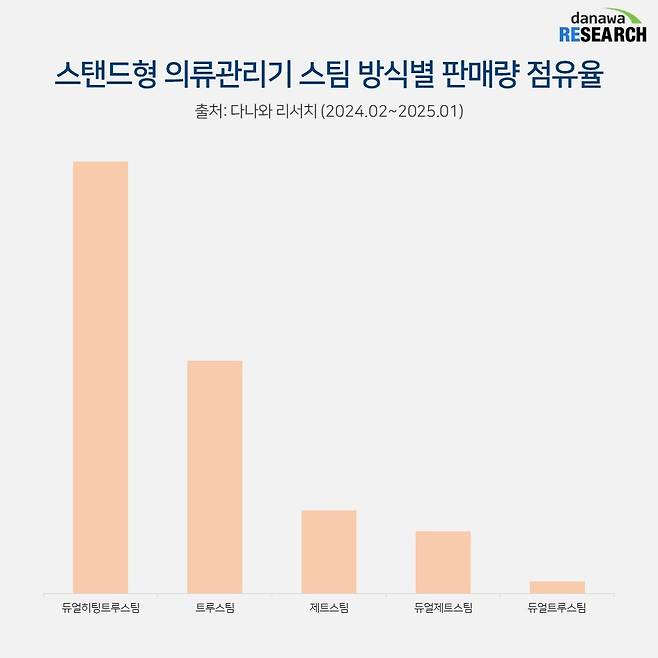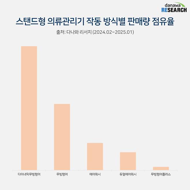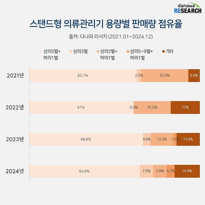 2022년까지만 해도 가성비 라인인 상의 3벌 + 하의 1벌 제품도 20%가 넘는 점유율을 차지하고 있었지만 2023년 10%로 떨어지고 2024년에는 7%로 급감했다. 이러한 하락세는 의류관리기 시장을 이끌고 있는 LG전자와 삼성전자에서 상의 5벌 이상의 제품을 주로 선보이고 있기 때문이다.