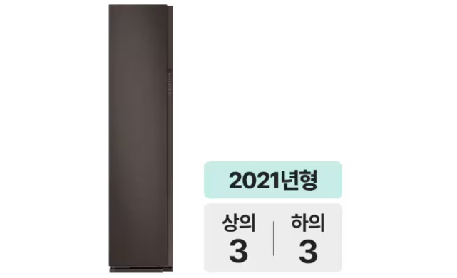 마지막 제품 또한 상의 5벌 하의 2벌의 대용량 라인이다. 먼지 제거는 에어워시로 해결하며 그 외 살균, 탈취, 구김 완화는 제트스팀으로 처리한다. 하단의 한 부분을 비워 두어 롱패팅, 롱코드와 같은 긴 옷도 케어가 가능하다. 실내 제습과 AI 건조 기능이 있어 제습을 수행하거나 건조 시간을 빠르게 설정할 수 있다. 크기는 595 x 1960 x 632mm.