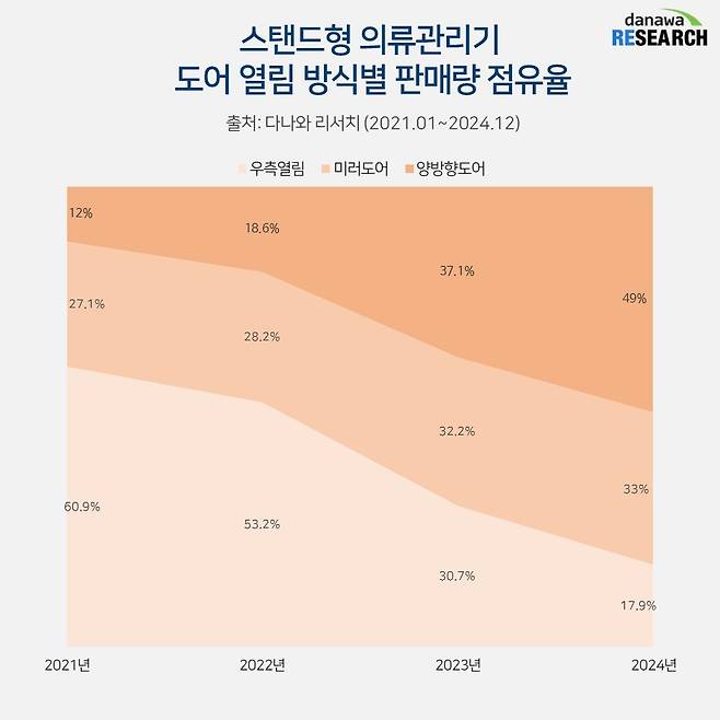 우측열림 제품은 2021년 60%대의 점유율에서 2022년 50%대로 내려갔고 2023년 30%대로 급감하더니 2024년 결국 10%대로 추락했다. 반면, 소비자가 설치 시 도어의 방향을 직접 선택하는 양방향 도어는 2022년 10%대에서 2024년 49%까지 큰 성장을 이뤘다. 이와 함께 도어에 거울을 달아 전신 거울로 활용해 공간 활용도를 높일 수 있는 미러도어 또한 30%대의 점유율을 유지하며 꾸준한 인기를 얻고 있다.