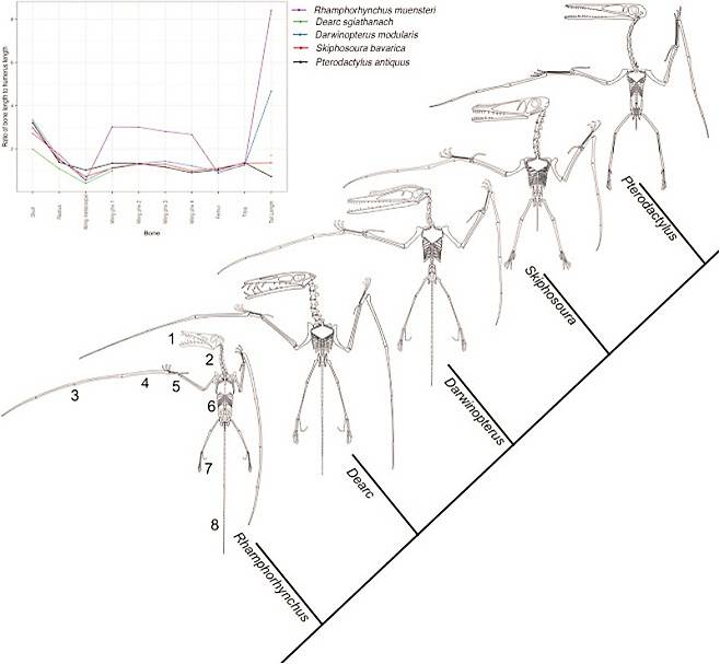 데이비드 연구원은 "양자의 특징은 정반대인데, 이러한 차이가 언제쯤 나타났는지 학자들이 알 만한 정보가 부족했다"며 "2010년 중국에서 발굴된 다르위놉테루스(다위노프테루스, Darwinopterus)가 소형종과 대형종의 중간에 해당해 겨우 둘 사이의 다리가 놓였다"고 설명했다.