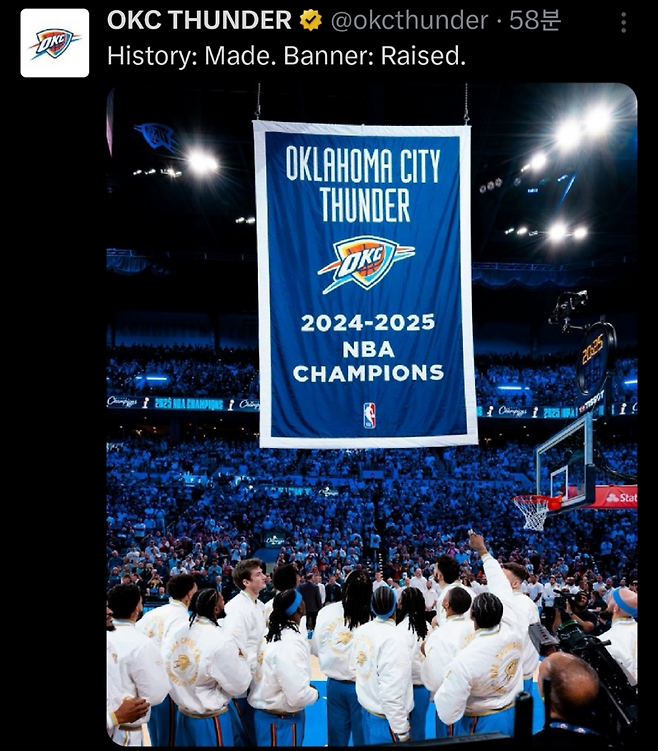 오클라호마시티 썬더는 22일(한국시간) 오클라호마시티의 홈 코트인 페이콤 센터에서 열린 2025~2026 NBA 개막 경기에서 휴스턴 로키츠를 125-124로 꺾었다. ‘디펜딩 챔피언’의 위용을 첫 경기부터 보여줬다.