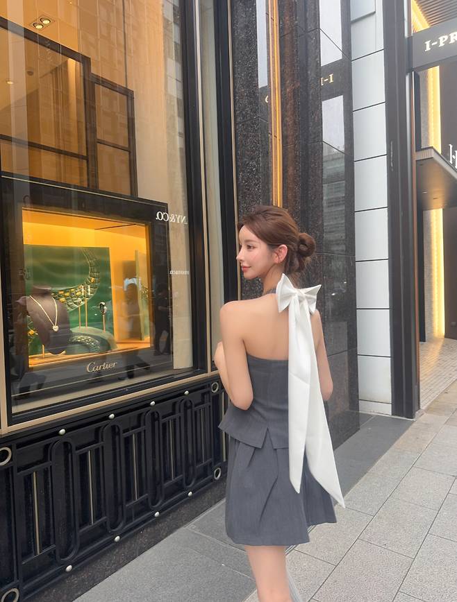 앞에서 보면 깔끔하지만, 등 뒤에 달린 대형 리본 디테일이 포인트예요.