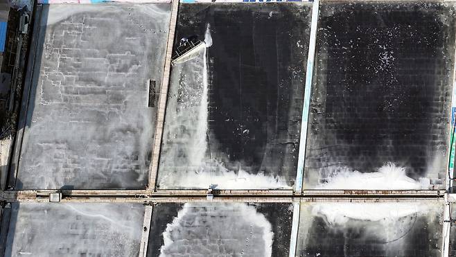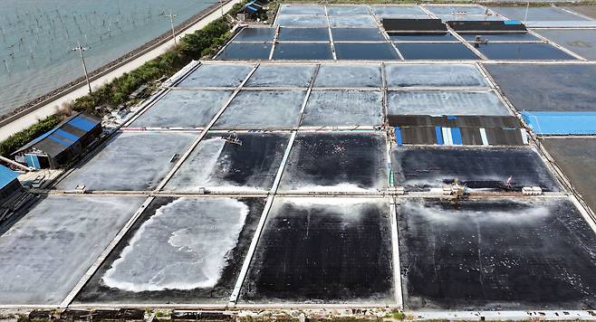 드론으로 바라본 도초도 염전의 모습이다. 하얀 소금 결정이 맺혀 있는 모습이 보이고 있다.