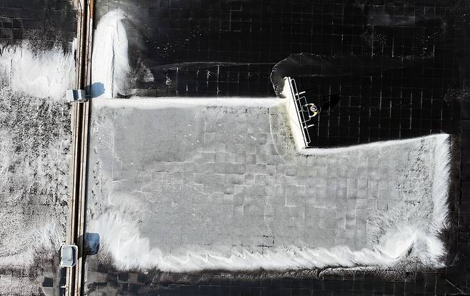 도초도 염전에서 한 염부가 자동화 기계로 소금을 채취하고 있다.