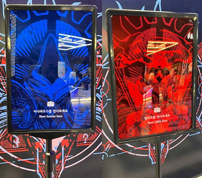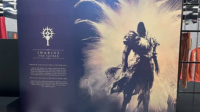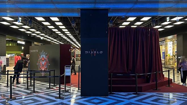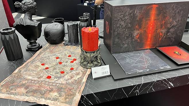 아마 입장하자마자 가장 먼저 눈길이 갈 중앙 전시대. 릴리트와 이나리우스의 거대 스태츄와 디아블로 IV 한정 소장판 박스가 전시되어 있습니다.