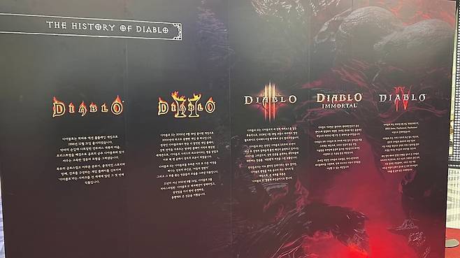 또 다른 벽면에서는 디아블로의 역사를 확인할 수 있었습니다. 게임에 대한 소개 문구가 적혀 있어서 상품 설명 같은 느낌입니다.