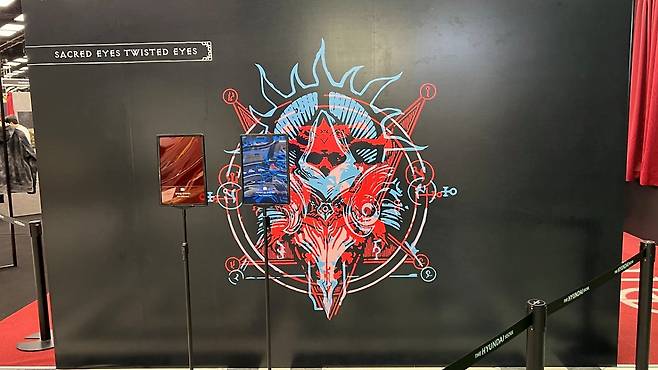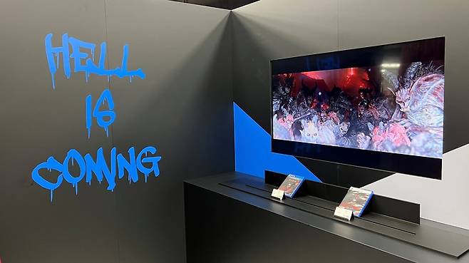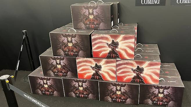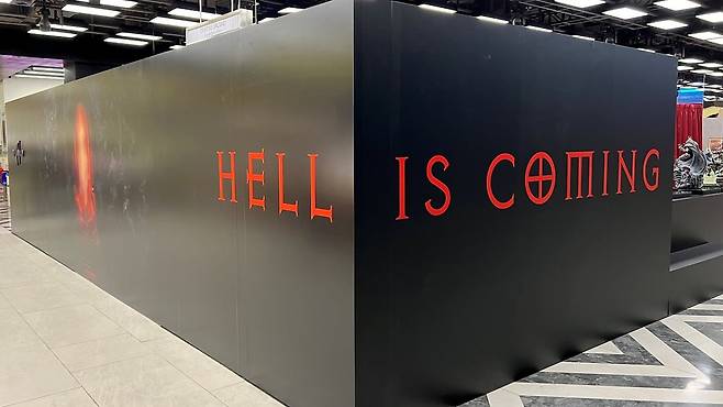 반대편 벽에는 플레이스테이션판 디아블로 IV를 전시 중입니다. 'HELL IS COMING'이 파란색인 것도 이를 상징하는 걸까요?