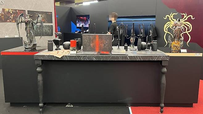아마 입장하자마자 가장 먼저 눈길이 갈 중앙 전시대. 릴리트와 이나리우스의 거대 스태츄와 디아블로 IV 한정 소장판 박스가 전시되어 있습니다.