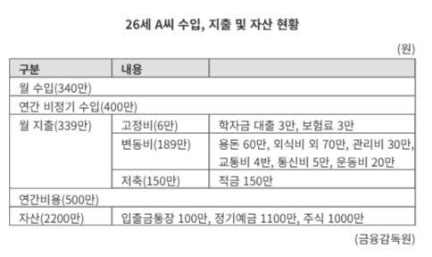 26세 A씨 월 수입은 340만원이다. 연간 비정기 수입은 400만원이 들어온다. 월 지출은 339만원이다. 고정비가 학자금 대출(3만원), 보험료(3만원) 등 6만원이다. 변동비는 용돈(60만원), 외식비 외(70만원), 관리비(30만원), 교통비(4만원), 통신비(5만원), 운동비(20만원) 등을 합쳐 189만원이다. 저축은 적금 150만원씩 하고 있다. 연간 비용은 500만원이다. 자산은 입출금통장(100만원), 정기예금(1100만원), 주식(1000만원) 등 2200만원이다. 부채로는 학자금 대출 300만원이 있다.