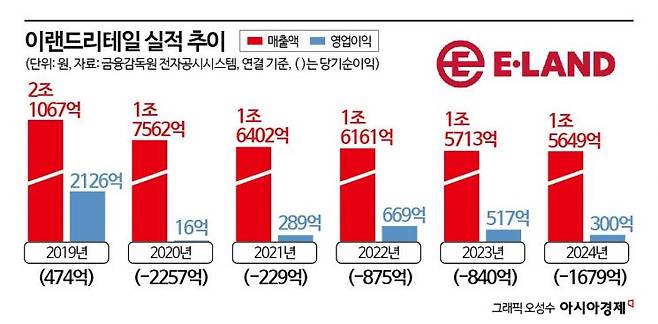 이랜드리테일은 2019년까지 연 매출 2조원이 넘는 실적을 달성하며 이랜드그룹을 이끄는 핵심 계열사로 꼽혔다. 하지만 코로나19 대유행을 기점으로 유통 시장이 온라인 중심으로 재편되면서 실적은 매년 곤두박질하고 있다. 2019년 2조1067억원이었던 매출은 2020년 1조7562억원으로 떨어진 뒤, 5년 연속 뒷걸음질했다. 지난해 매출액은 1조5649억원에 그쳤다. 이 기간 영업이익은 2000억원대에서 300억원으로 대폭 줄었고, 당기순적자는 지난해 1600억원까지 불어났다.
