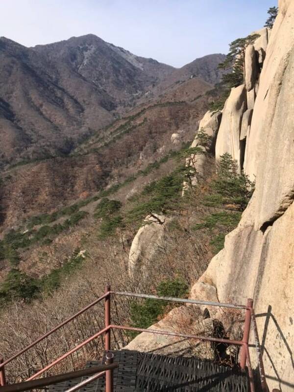 비선대 바위를 지나 금강굴로 향하는 길은 경사가 가파르고 바위 계단이 많아 주의가 필요해요. 하지만 그만큼 아름다운 풍경이 기다리고 있습니다. 봄철에는 새싹이 돋은 나무들 사이로 보이는 천불동계곡의 모습이 일품이에요.
