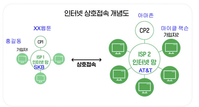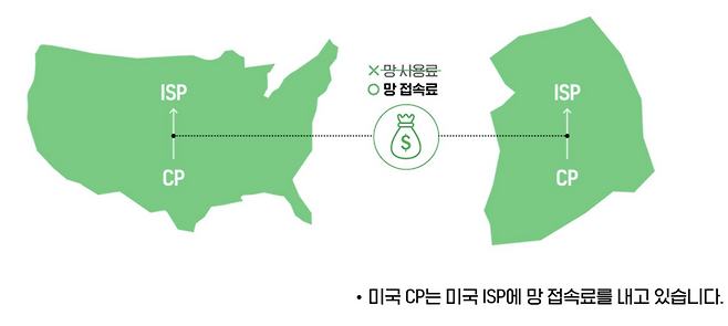 인터넷 서비스는 기간통신사업자(Internet Service Provider:ISP)와 부가통신사업자(Content & Application Provide:CAP)가 제공한다. KT, SK브로드밴드 등 통신사업자는 ISP고 네이버, 넷플릭스처럼 망을 활용해 서비스를 제공하는 사업자는 CP다.