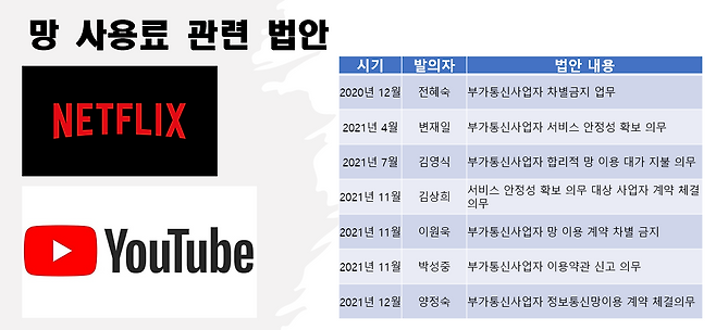 법안에는 넷플릭스, 유튜브 같은 콘텐츠 사업자가 망을 이용해 많은 돈을 벌고, 망을 다른 사람보다 훨씬 많이 사용하는데 그에 대한 비용을 지불하지 않는다는 문제 의식이 담겨 있다.
