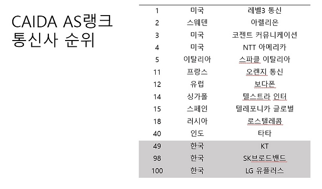 안타깝게도 한국 통신사 중에는 글로벌 1등급 사업자가 없다. 국내에서 가장 큰 네트워크를 보유하고 있는 KT 조차 글로벌 기준 2등급(2계위) 사업자다. 국내 통신사들은 국내 통신망을 과점하고 있지만 세계적인 수준에서는 양적/질적에서 미흡하기 때문이다. 해외 트래픽이 많아지면 더 큰 접속이 필요하고, 국내 통신사는 해외 통신사에 더 많은 비용(트랜짓)을 지불해야 한다.