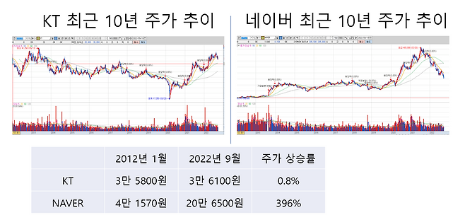 통신사와 콘텐츠 사업자는 네트워크를 풍요롭게 만드는 양축임에도 불구하고 두 사업자의 수익성 격차는 급격하게 확대되고 있다. 통신사업자의 성장은 둔화됐고 콘텐츠 사업자는 급격하게 성장했다. 최근 10년 단순 주가 지수를 비교해보면 대표적인 통신사업자 KT는 0.8% 성장하는데 그쳤는데 반해 콘텐츠사업자 네이버는 396% 성장했다.