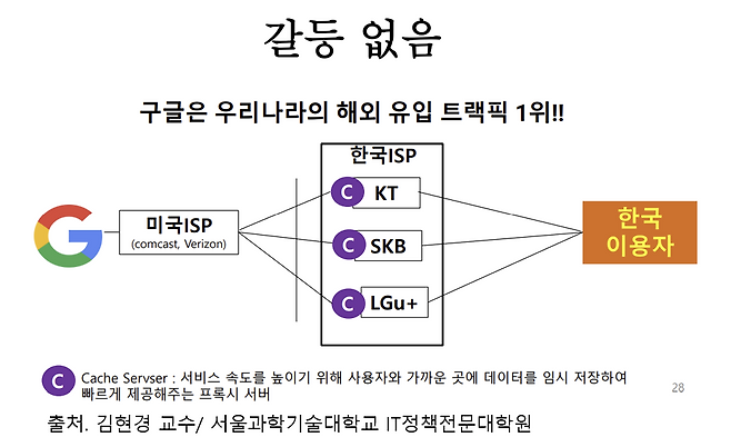 구글은 국내 통신 3사에 캐시서버를 설치했다. 캐시서버는 자주 이용되는 콘텐츠를 임시로 보관하는 서버다. 구글이 가지고 있는 데이터는 미국 서버에 있지만 한국 사람들이 자주 이용하는 콘텐츠는 임시로 한국 캐시서버에 둔다.