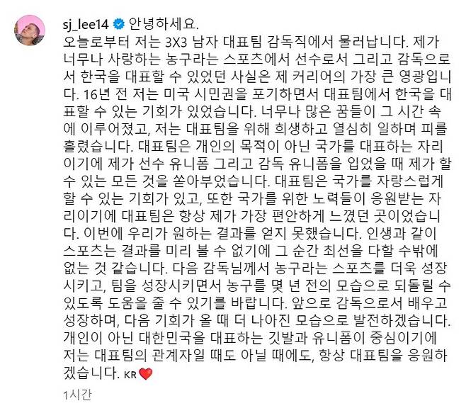 오늘로부터 저는 3X3 남자 대표팀 감독직에서 물러납니다. 제가 너무나 사랑하는 농구라는 스포츠에서 선수로서 그리고 감독으로서 한국을 대표할 수 있었던 사실은 제 커리어의 가장 큰 영광입니다. 16년 전 저는 미국 시민권을 포기하면서 대표팀에서 한국을 대표할 수 있는 기회가 있었습니다. 너무나 많은 꿈들이 그 시간 속에 이루어졌고, 저는 대표팀을 위해 희생하고 열심히 일하며 피를 흘렸습니다. 대표팀은 개인의 목적이 아닌 국가를 대표하는 자리이기에 제가 선수 유니폼 그리고 감독 유니폼을 입었을 때 제가 할 수 있는 모든 것을 쏟아부었습니다. 대표팀은 국가를 자랑스럽게 할 수 있는 기회가 있고, 또한 국가를 위한 노력들이 응원받는 자리이기에 대표팀은 항상 제가 가장 편안하게 느꼈던 곳이었습니다. 이번에 우리가 원하는 결과를 얻지 못했습니다. 인생과 같이 스포츠는 결과를 미리 볼 수 없기에 그 순간 최선을 다할 수밖에 없는 것 같습니다. 다음 감독님께서 농구라는 스포츠를 더욱 성장시키고, 팀을 성장시키면서 농구를 몇 년 전의 모습으로 되돌릴 수 있도록 도움을 줄 수 있기를 바랍니다. 앞으로 감독으로서 배우고 성장하며, 다음 기회가 올 때 더 나아진 모습으로 발전하겠습니다. 개인이 아닌 대한민국을 대표하는 깃발과 유니폼이 중심이기에 저는 대표팀의 관계자일 때도 아닐 때에도, 항상 대표팀을 응원하겠습니다. KR ♥