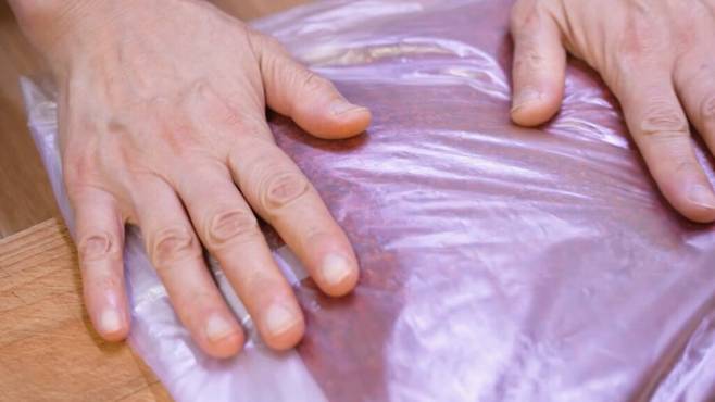 고춧가루를 지퍼백에 넣고 2/3 정도만 채워 공기를 최대한 빼서 밀봉하세요. 이중 지퍼백을 사용하면 더 튼튼하고 안전합니다.