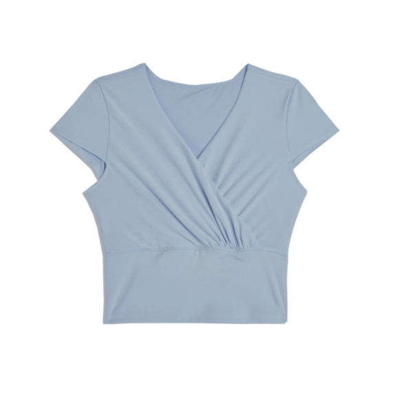 크롭 기장의 셔링 디자인은 자연스럽게 허리 라인을 강조해주고, 내장된 탈착형 패드가 기능성과 디자인 양면에서 실용성을 높여준다.