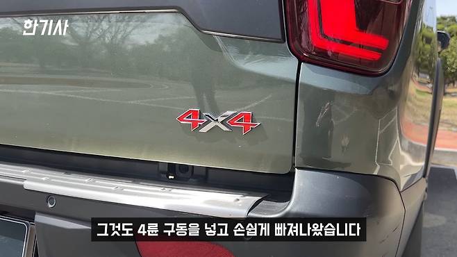 그리고 이 차의 4륜 구동 성능에 장점이 있는데요. 저의 아버지 차가 세단인데, 진흙탕에 빠진 적 있습니다. 그래서 제 차에 고리를 걸고 빠져나온 적이 있어요. 이 차는 견인 능력이 또 탁월하거든요. 그리고 이 차는 산길이나 비포장도로를 좀 여유 있게 갈 수가 있습니다. 이게 오프로드 갈 때는 큰 장점이 되는 것 같습니다. 높은 RPM을 쓰지 않고 적절한 RPM으로 안정적으로 주행한다는 느낌을 받으실 수 있습니다. 그리고 산길을 운전할 때 배수로에 앞바퀴가 빠진 적이 있는데, 그것도 4륜 구동을 넣고 손쉽게 빠져 나왔습니다.