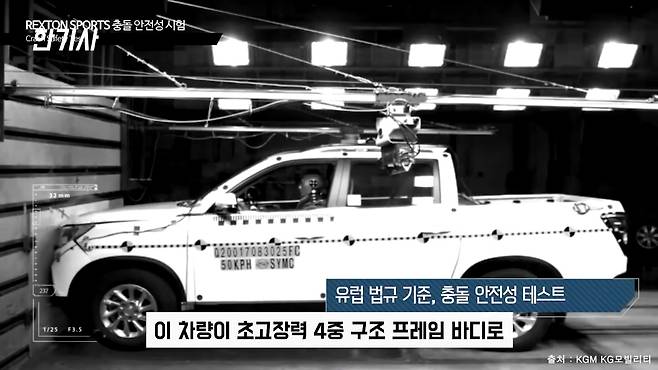 그리고 또 다른 장점은 차체 강성입니다. 투싼을 가지고 산에 갈 때는 차 하체가 좀 흔들린다는 느낌이 있었는데, 이 렉스턴 스포츠 같은 경우에는 차체가 단단해서 지면을 잘 밟고 또 안정되게 간다는 그런 느낌을 받았습니다. 이 차량이 초고장력 4중 구조 프레임 바디로 전면 충돌식 차량에 가해지는 충격을 최대한 흡수를 하고요. 차체 프레임에 79.2%나 고장력 강판을 사용을 하여가지고 쌍용차만의 이 프레임 바디라는 강점이 있을 것 같아요.