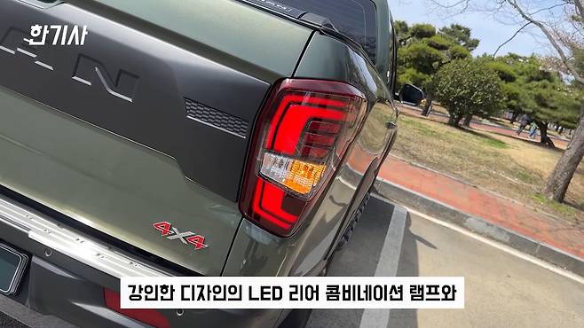 또 다른 장점은 남성적인 디자인입니다. '그냥 나는 다른 건 모르겠고, 남성적인 디자인의 차를 갖고 싶다'고 하시면 이 차를 타시면 무조건 됩니다. 전기형 렉스턴 스포츠 칸에서 페이스리프트가 되면서 더욱 스포티해진 전면부 디자인이 눈에 띄는 것이 특징이고요. 'KHAN' 레터링이 박힌 가로 형태의 익스페디션 전용 블랙 라디에이터 그릴이 굉장히 스포티하게 자리하고 있어요. 날렵한 HID 헤드램프와 더불어서 특히 보닛에 적용이 된 2개의 후드 패션 가니쉬가 스포티함을 6스푼 정도 넣어주고 있어요. 그리고 안개등이 가로 형태에서 세로 형태로 변경이 되면서 더욱더 강인한 전면부 인상을 보여주고 있는 것 같습니다.