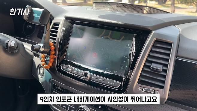 그리고 저는 실내 디자인도 마음에 드는데요. G4 렉스턴을 베이스로 만들었기 때문에 레이아웃이 G4 렉스턴과 거의 동일한 것이 특징인 것 같은데요. 9인치 인포콘 내비게이션의 시인성이 뛰어나고, 버튼들이 큼직큼직하게 돼 있어서 참 이게 마음에 듭니다. 하지만 조금 아쉬운 게 기어 노브 위치가 정중앙에 위치해 있기 때문에 공간 효율성에 대해서는 커피 꽂아 놓는 것도 포기를 하셔야 됩니다. 그리고 콘솔 박스에 있는 공기청정 시스템이 미세먼지에 대한 소소한 해결책이 될 수 있을 것 같고, 전체적인 실내 마감들이 렉스턴을 베이스로 해 꽤나 깔끔한 실내 마감 품질을 보여주고 있는 것 같아요.