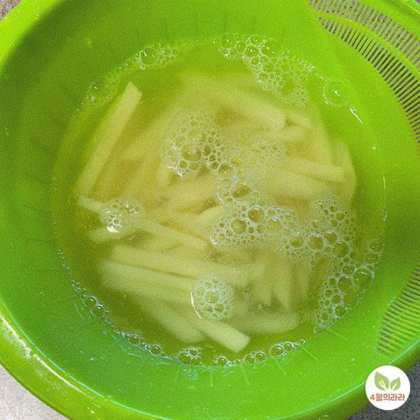 감자는 큼직하게 채를 썰어 물에 담가 전분을 빼주세요. 두어 번 물에 헹궈주면 되는데, 이 과정은 생략해도 상관없습니다. 또한 감자를 길이로 잘라 조리하면 훨씬 빨리 익어서 좋아요.