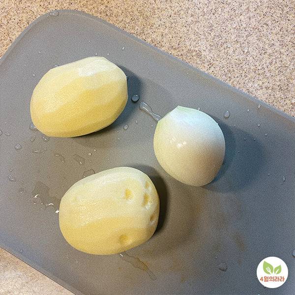 동네 마트에서 세일한 감자 2kg 사 왔어요. 오천 원 정도 했는데, 저렴하죠. 내내 먹던 고구마가 질리던 참에 잘 되었습니다. 감자 2개 껍질을 까서 준비했어요. 남은 양파도 작은 게 있어 넣어 주려고요.